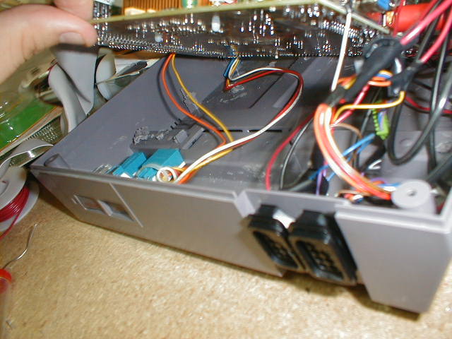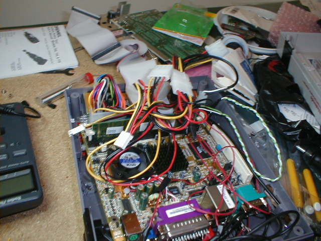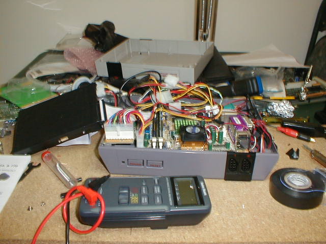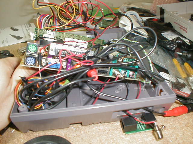 Now we have a working system that plays games. It is now time to cram the computer into little NES box. For this I used the EPIA 800 main board. It's super small and has on board tv-out, sound and network (among other things). I added 256MB ram, 20 GB hard drive and installed win2k. This board uses a normal atx power supply. I did not have room for one, so I searched for an external one. The Morex Cubid 2677 had an external powersupply. Instead of figuring out where they got theirs from, I just bought the case and stripped out the power supply. NExt came the fun part. Buy a cheap broken NES and gut it. Then take the dremmel and cut everything except the 4 screws in the corners.